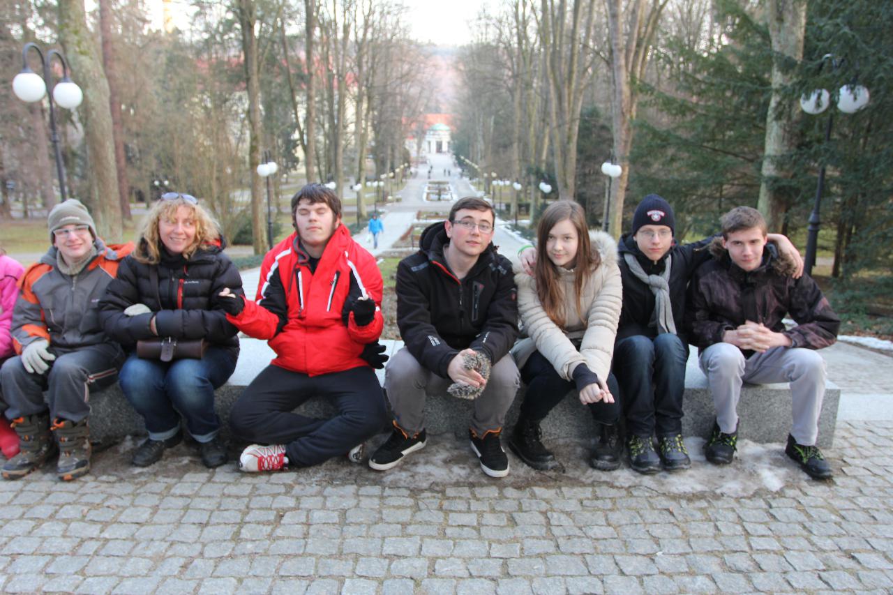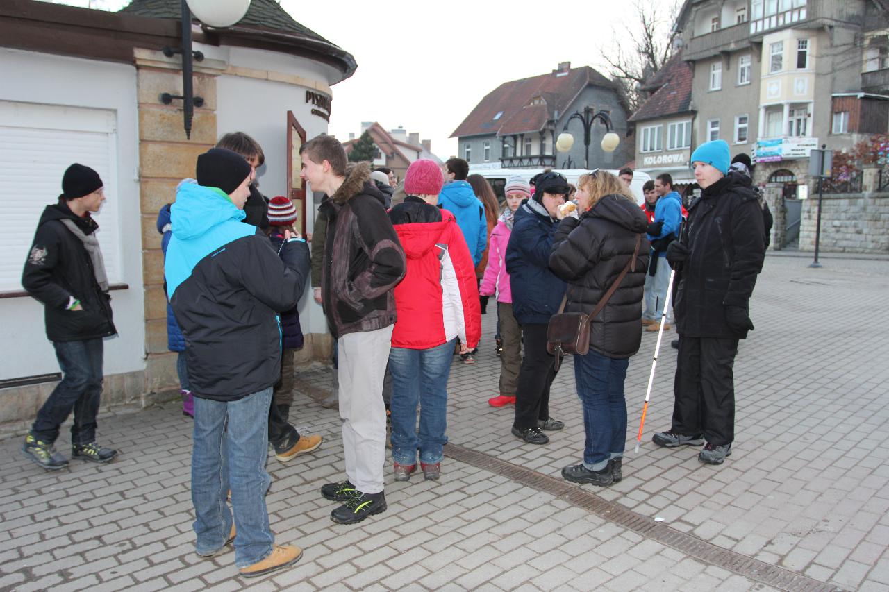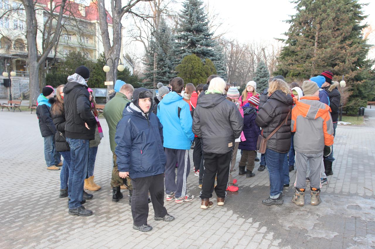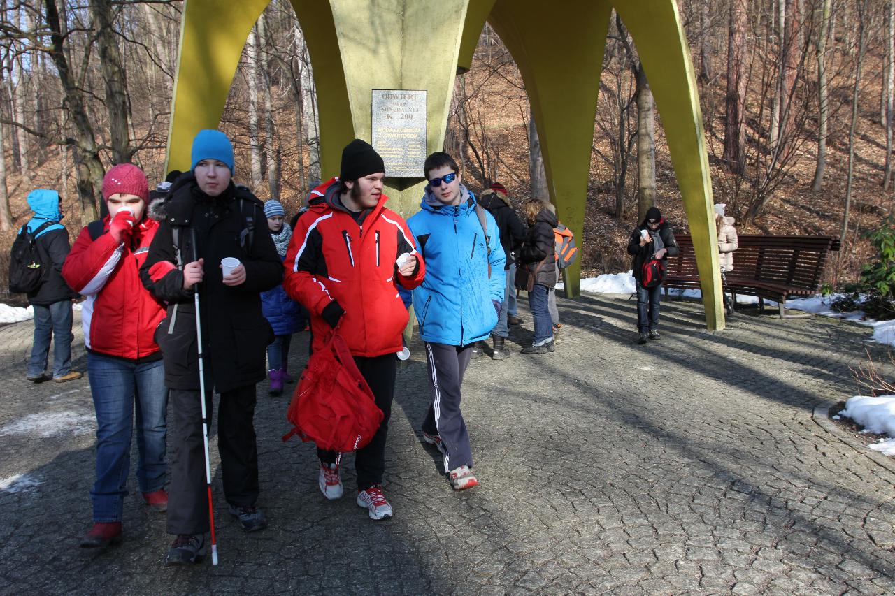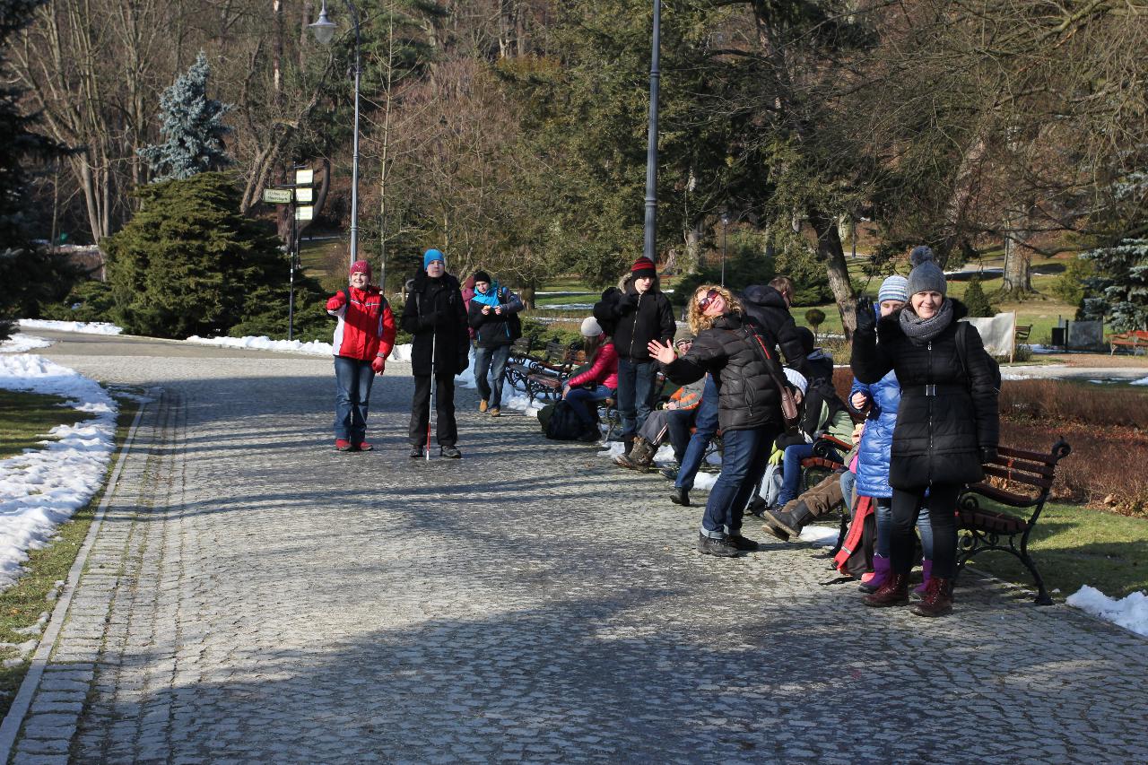 Punktualnie o dziewiątej jedziemy autokarem do Wambierzyc. Przewodnikiem jest Pan Stanisław, a za kierownicą autokaru siedzi Pan Józef. W Wambierzycach zwiedzamy Sanktuarium Maryjne. Świątynia z zewnątrz i wewnątrz robi na wszystkich ogromne wrażenie. Pan Stanisław barwnie przybliża jej historię. Po pamiątkowym grupowym zdjęciu na schodach przed kościołem ruszamy poznać cześć dróżek kalwarii wambierzyckiej. Następnie ruszamy zobaczyć ruchomą szopkę bożonarodzeniową wykonaną przez Longina Wittiga i jego syna Hermanna. Szopkę i pozostałe ruchome ekspozycję poznajemy dzięki audiodeskrypcji kadry. Dalej podążamy „drogą 100 zakrętów” i docieramy do miejscowości Czermna koło Kudowy. Tu czeka nas niesamowite przeżycie podczas zwiedzaniu Kaplicy Czaszek. Po poznaniu tego szczególnego miejsca wędrujemy pieszo do Kudowy Zdroju. Degustujemy tam wodę mineralną, zwiedzamy park zdrojowy i poznajemy historię uzdrowiska. Jest też chwila czasu na zjedzenie posiłku. Następnie wyruszamy autokarem do Dusznik Zdroju. Ta uzdrowiskowa miejscowość zaskakuje nas leżącym jeszcze śniegiem i swoim urokiem. W trakcie zwiedzania Dusznik Zdroju docieramy do Dworku Fryderyka Chopina gdzie na tle muzyki kompozytora przedstawiona jest historia jego pobytu w kurorcie w sierpniu 1826 roku. Ostatnim punktem wycieczki jest Polanica Zdrój. Poznajemy jej historię i najważniejsze obiekty zdrojowe, a następnie ustawiamy się w długiej kolejce by zdegustować słynne polanickie gofry. Zadowoleni i zmęczeni wracamy do Lądka Zdroju śpiewając piosenki i zadając sobie zagadki. Punktualnie o dwudziestej spotykamy się w kawiarni na osiemnastce Krzyśka. Jest tort z osiemnastoma świeczkami, szampan Piccolo, gromkie 100-lat, podrzucanie osiemnaście razy i życzenia. Po degustacji słodkości Krzysiek porywa na parkiet Kingę i rozpoczynamy dyskotekę. Impreza dobrze się rozkręca przy muzyce, którą jako DJ serwuje Mateusz. Wszyscy świetnie się bawią, a kadra zastanawia się skąd młodzież ma jeszcze na to siły.