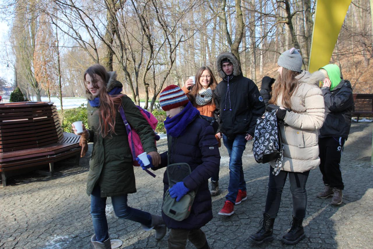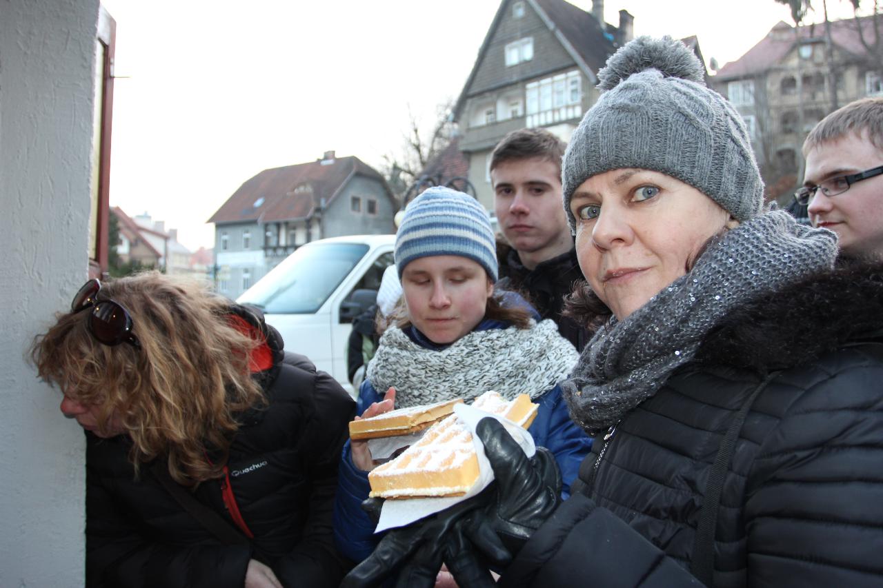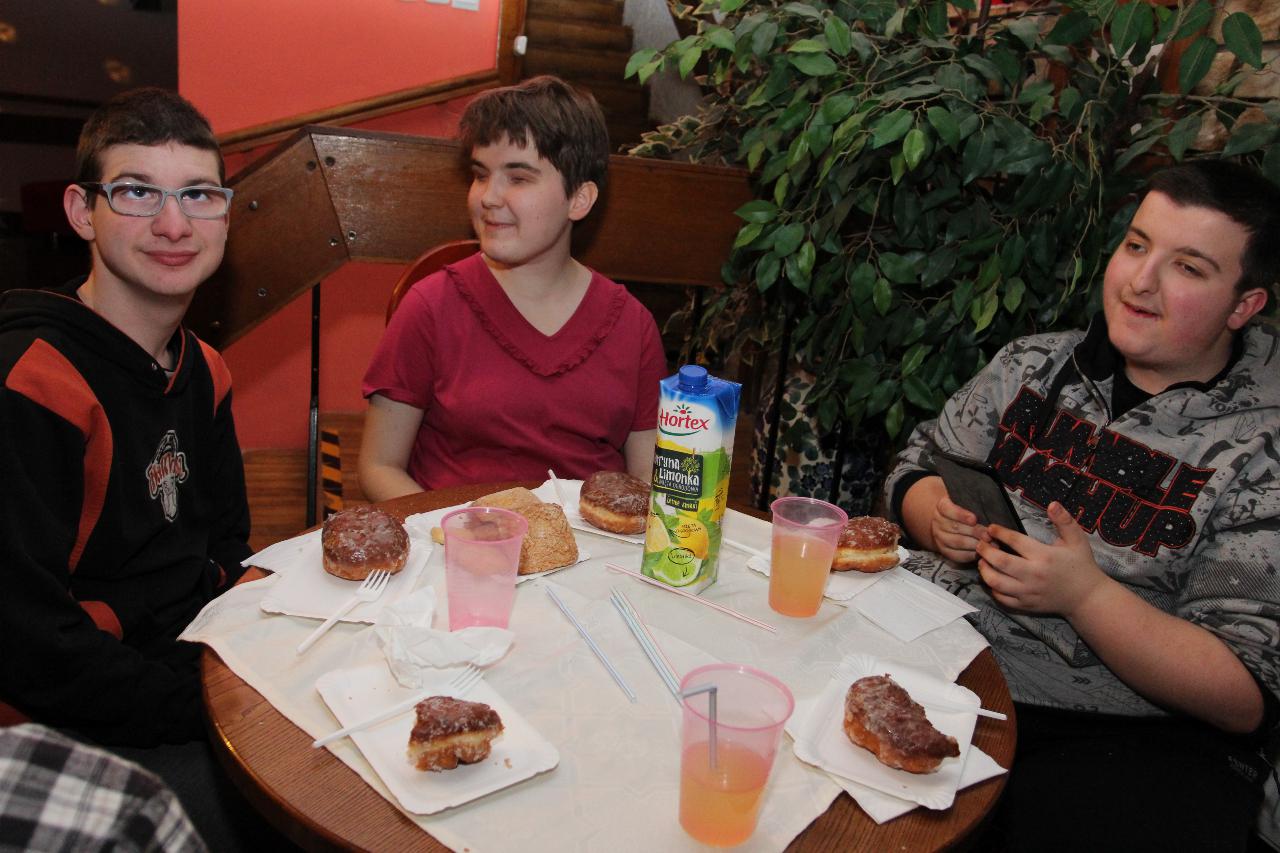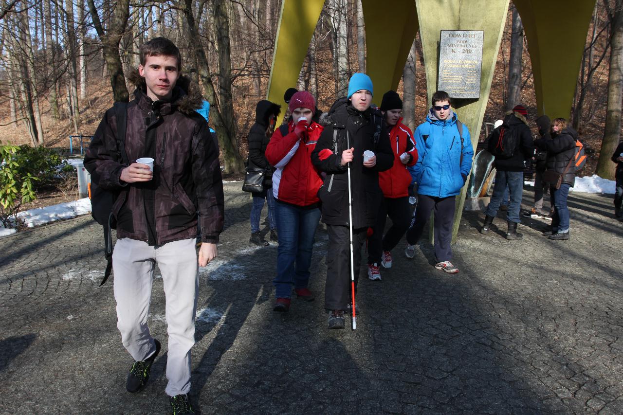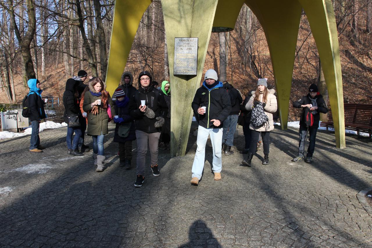 Punktualnie o dziewiątej jedziemy autokarem do Wambierzyc. Przewodnikiem jest Pan Stanisław, a za kierownicą autokaru siedzi Pan Józef. W Wambierzycach zwiedzamy Sanktuarium Maryjne. Świątynia z zewnątrz i wewnątrz robi na wszystkich ogromne wrażenie. Pan Stanisław barwnie przybliża jej historię. Po pamiątkowym grupowym zdjęciu na schodach przed kościołem ruszamy poznać cześć dróżek kalwarii wambierzyckiej. Następnie ruszamy zobaczyć ruchomą szopkę bożonarodzeniową wykonaną przez Longina Wittiga i jego syna Hermanna. Szopkę i pozostałe ruchome ekspozycję poznajemy dzięki audiodeskrypcji kadry. Dalej podążamy „drogą 100 zakrętów” i docieramy do miejscowości Czermna koło Kudowy. Tu czeka nas niesamowite przeżycie podczas zwiedzaniu Kaplicy Czaszek. Po poznaniu tego szczególnego miejsca wędrujemy pieszo do Kudowy Zdroju. Degustujemy tam wodę mineralną, zwiedzamy park zdrojowy i poznajemy historię uzdrowiska. Jest też chwila czasu na zjedzenie posiłku. Następnie wyruszamy autokarem do Dusznik Zdroju. Ta uzdrowiskowa miejscowość zaskakuje nas leżącym jeszcze śniegiem i swoim urokiem. W trakcie zwiedzania Dusznik Zdroju docieramy do Dworku Fryderyka Chopina gdzie na tle muzyki kompozytora przedstawiona jest historia jego pobytu w kurorcie w sierpniu 1826 roku. Ostatnim punktem wycieczki jest Polanica Zdrój. Poznajemy jej historię i najważniejsze obiekty zdrojowe, a następnie ustawiamy się w długiej kolejce by zdegustować słynne polanickie gofry. Zadowoleni i zmęczeni wracamy do Lądka Zdroju śpiewając piosenki i zadając sobie zagadki. Punktualnie o dwudziestej spotykamy się w kawiarni na osiemnastce Krzyśka. Jest tort z osiemnastoma świeczkami, szampan Piccolo, gromkie 100-lat, podrzucanie osiemnaście razy i życzenia. Po degustacji słodkości Krzysiek porywa na parkiet Kingę i rozpoczynamy dyskotekę. Impreza dobrze się rozkręca przy muzyce, którą jako DJ serwuje Mateusz. Wszyscy świetnie się bawią, a kadra zastanawia się skąd młodzież ma jeszcze na to siły.