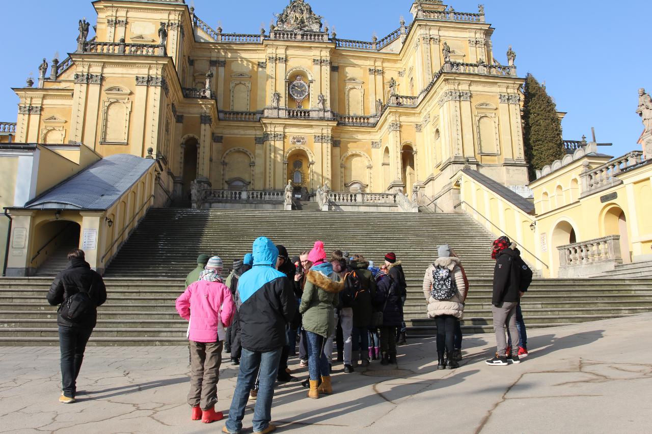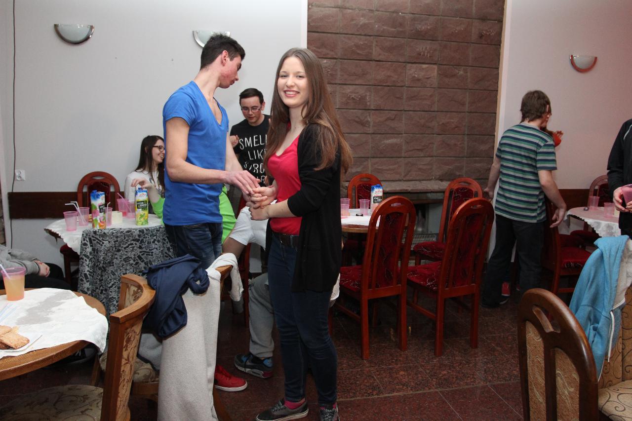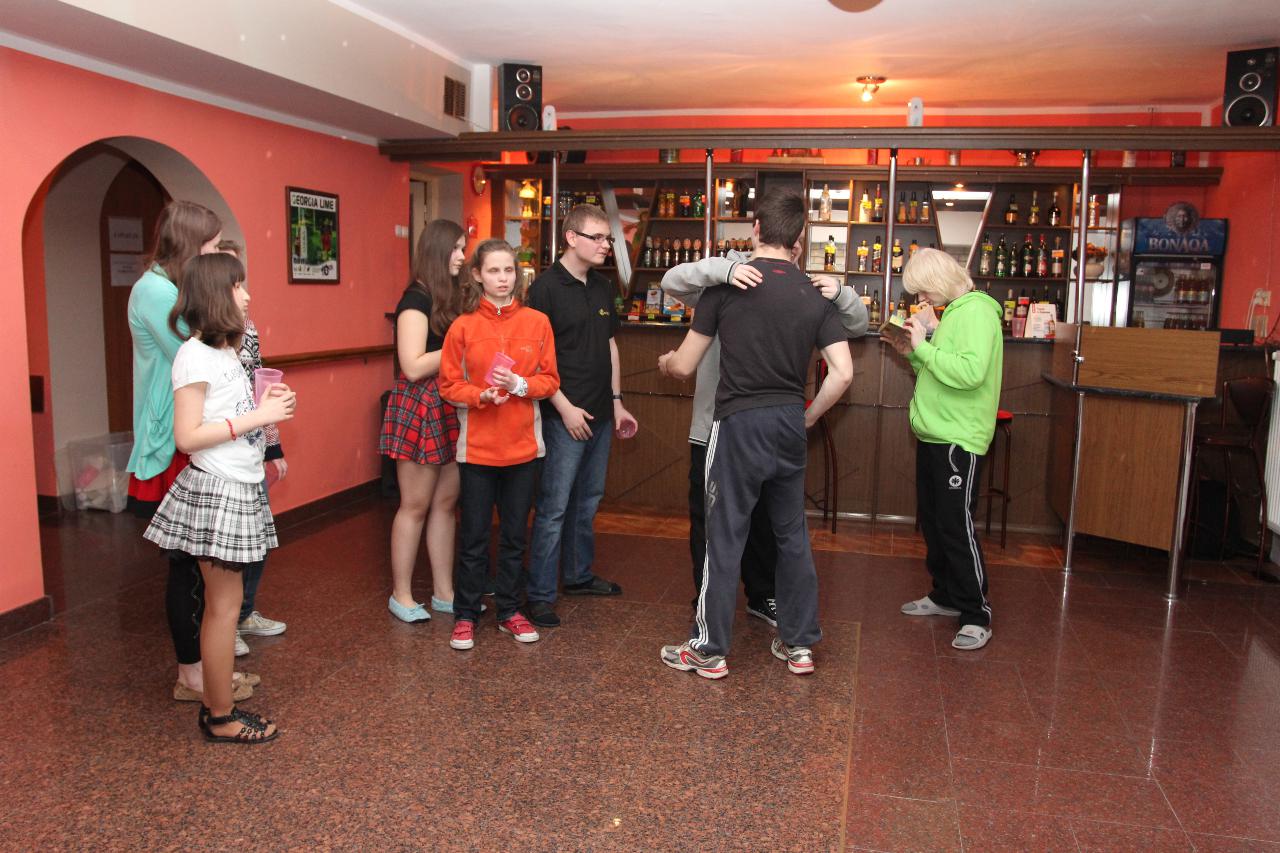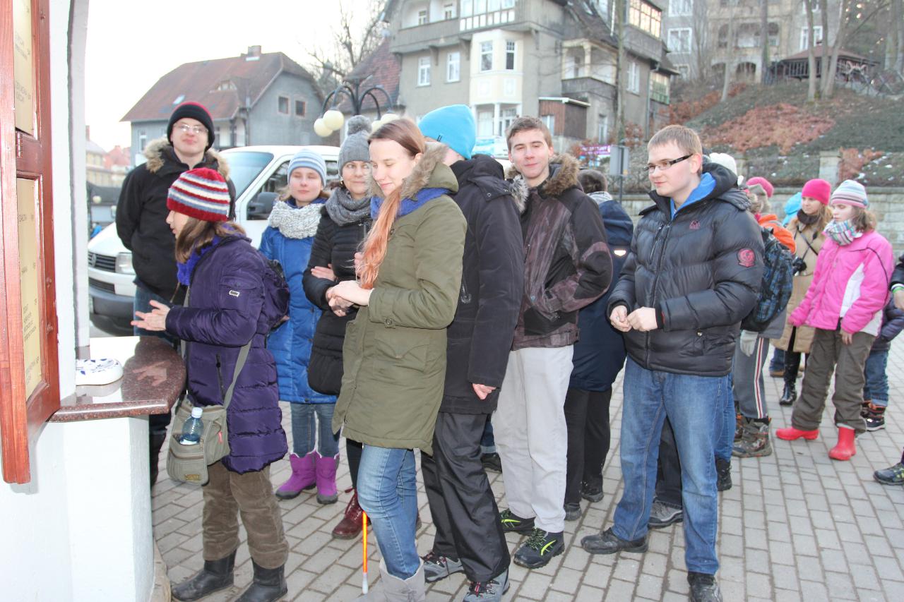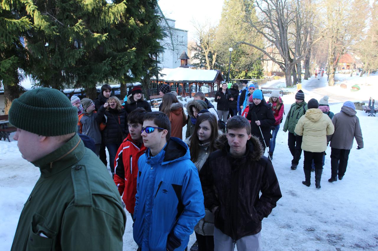 Punktualnie o dziewiątej jedziemy autokarem do Wambierzyc. Przewodnikiem jest Pan Stanisław, a za kierownicą autokaru siedzi Pan Józef. W Wambierzycach zwiedzamy Sanktuarium Maryjne. Świątynia z zewnątrz i wewnątrz robi na wszystkich ogromne wrażenie. Pan Stanisław barwnie przybliża jej historię. Po pamiątkowym grupowym zdjęciu na schodach przed kościołem ruszamy poznać cześć dróżek kalwarii wambierzyckiej. Następnie ruszamy zobaczyć ruchomą szopkę bożonarodzeniową wykonaną przez Longina Wittiga i jego syna Hermanna. Szopkę i pozostałe ruchome ekspozycję poznajemy dzięki audiodeskrypcji kadry. Dalej podążamy „drogą 100 zakrętów” i docieramy do miejscowości Czermna koło Kudowy. Tu czeka nas niesamowite przeżycie podczas zwiedzaniu Kaplicy Czaszek. Po poznaniu tego szczególnego miejsca wędrujemy pieszo do Kudowy Zdroju. Degustujemy tam wodę mineralną, zwiedzamy park zdrojowy i poznajemy historię uzdrowiska. Jest też chwila czasu na zjedzenie posiłku. Następnie wyruszamy autokarem do Dusznik Zdroju. Ta uzdrowiskowa miejscowość zaskakuje nas leżącym jeszcze śniegiem i swoim urokiem. W trakcie zwiedzania Dusznik Zdroju docieramy do Dworku Fryderyka Chopina gdzie na tle muzyki kompozytora przedstawiona jest historia jego pobytu w kurorcie w sierpniu 1826 roku. Ostatnim punktem wycieczki jest Polanica Zdrój. Poznajemy jej historię i najważniejsze obiekty zdrojowe, a następnie ustawiamy się w długiej kolejce by zdegustować słynne polanickie gofry. Zadowoleni i zmęczeni wracamy do Lądka Zdroju śpiewając piosenki i zadając sobie zagadki. Punktualnie o dwudziestej spotykamy się w kawiarni na osiemnastce Krzyśka. Jest tort z osiemnastoma świeczkami, szampan Piccolo, gromkie 100-lat, podrzucanie osiemnaście razy i życzenia. Po degustacji słodkości Krzysiek porywa na parkiet Kingę i rozpoczynamy dyskotekę. Impreza dobrze się rozkręca przy muzyce, którą jako DJ serwuje Mateusz. Wszyscy świetnie się bawią, a kadra zastanawia się skąd młodzież ma jeszcze na to siły.